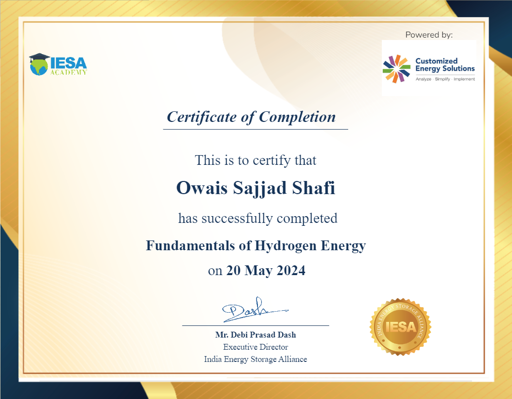 This certificate (ID: CERT-795905273172991987373581915933 ) verifies that Owais Sajjad Shafi has successfully completed the Fundamentals of Hydrogen Energy on May 20, 2024.